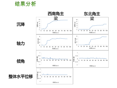 2、混凝土澆筑到對(duì)應(yīng)監(jiān)測(cè)點(diǎn)區(qū)域時(shí)段時(shí),該點(diǎn)處立桿變形、應(yīng)力變化達(dá)到最大值,且該變化具有突發(fā)性、持續(xù)時(shí)間短,變化速率大的特點(diǎn),此時(shí)高支模危險(xiǎn)性最大。因此,在該時(shí)段需密切關(guān)注各項(xiàng)監(jiān)測(cè)參數(shù)的變化情況;