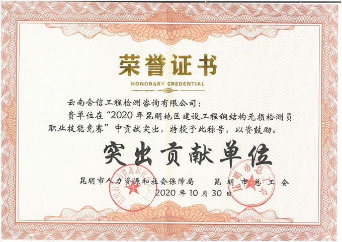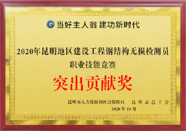 同時,我司作為技術(shù)支持單位協(xié)助云南省工程檢測協(xié)會舉辦了2020年昆明地區(qū)建設(shè)工程鋼結(jié)構(gòu)無損檢測員職業(yè)技能競賽活動。此次技能競賽選拔出了一批技藝精湛、善于解決技術(shù)難題的技術(shù)尖兵,不僅使檢測機構(gòu)有效地判斷自身鋼結(jié)構(gòu)無損檢測的水平,取長補短,也促進昆明市地區(qū)建筑工程檢測行業(yè)鋼結(jié)構(gòu)檢測整體水平的提升。在此次技能競賽活動中我司提供了大力支持、表現(xiàn)突出,因此獲得了由昆明市人力資源和社會保障局、昆明市總工會頒發(fā)的突出貢獻獎獎牌和榮譽證書。