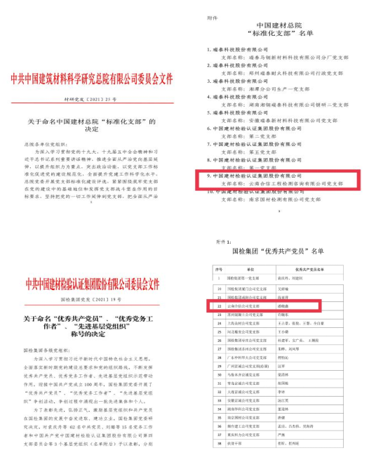 近日,根據(jù)中共中國建筑材料科學(xué)研究總院有限公司委員會印發(fā) 《關(guān)于命名中國建材總院“標(biāo)準(zhǔn)化支部”的決定》,云南合信工程檢測咨詢有限公司黨支部榮獲中國建材總院 “標(biāo)準(zhǔn)化支部”稱號,支部黨員潘曉鑫獲國檢集團(tuán)“優(yōu)秀共產(chǎn)黨員”榮譽稱號。