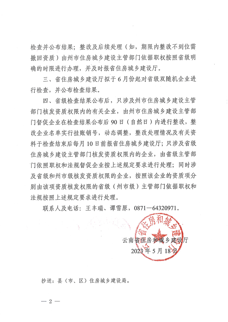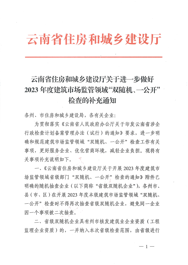 云南省住房和城鄉(xiāng)建設(shè)廳關(guān)于進(jìn)一步做好2023年度建筑市場(chǎng)監(jiān)管領(lǐng)域“雙隨機(jī)、一公開(kāi)”檢查的補(bǔ)充通知
