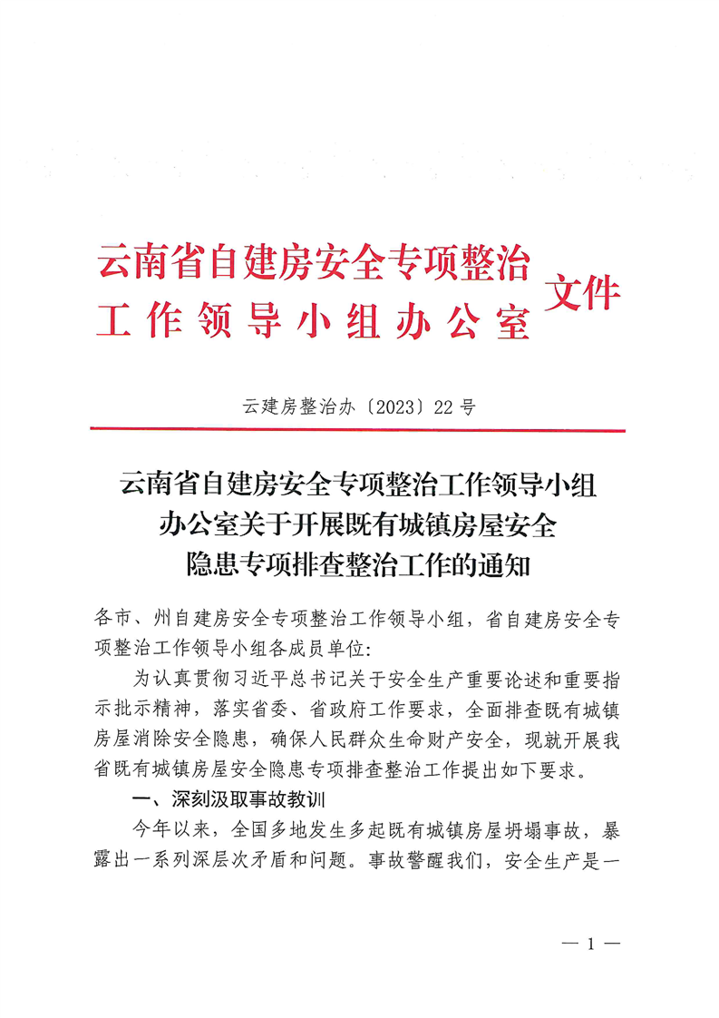 云南省自建房安全專項整治工作領(lǐng)導(dǎo)小組辦公室關(guān)于開展既有城鎮(zhèn)房屋安全隱患專項排查整治工作的通知